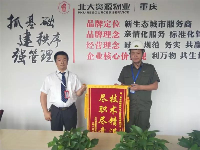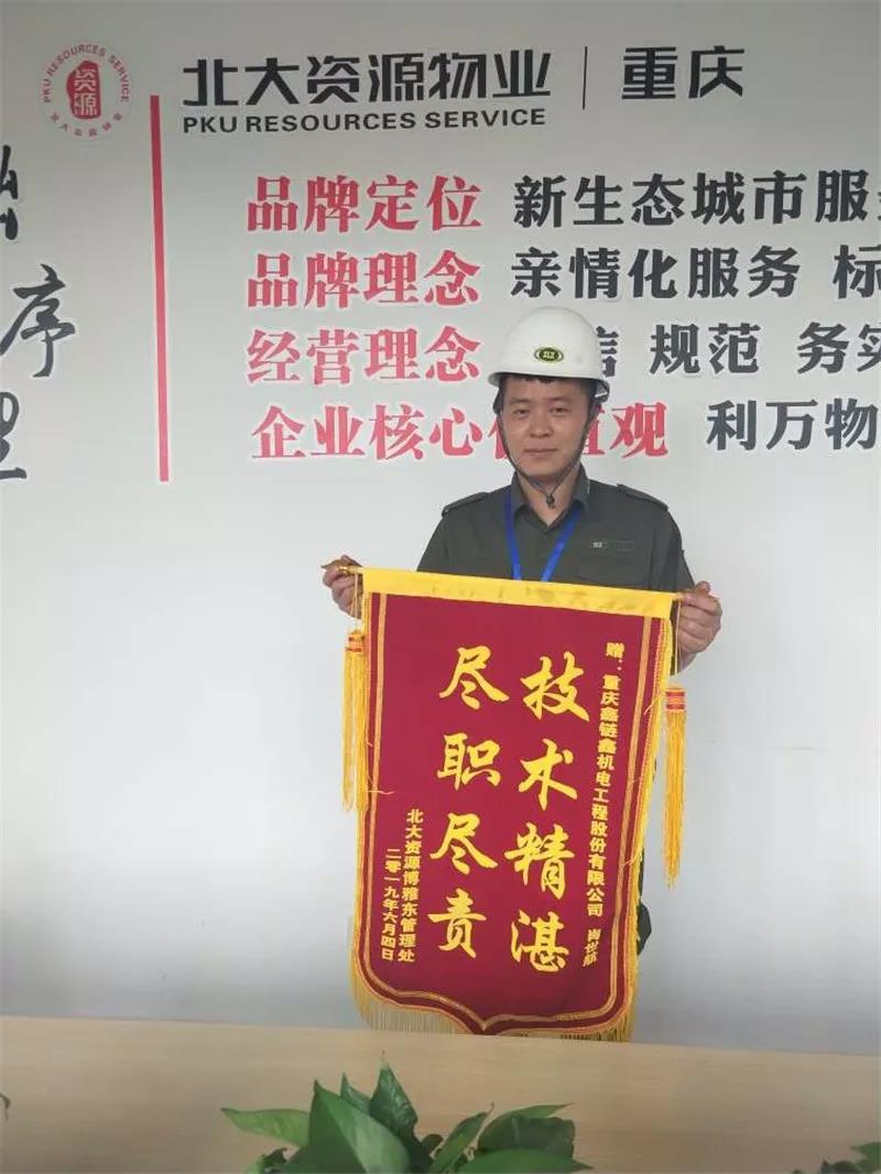 自入驻项目以来,重庆鑫链鑫机电工程股份有限公司与北大资源物业管理处保持紧密的沟通,提供优质的服务,确保项目电梯的正常运行。2019年6月,北大资源.博雅东项目给予我们服务极大肯定及认可,并颁发了荣誉锦旗。