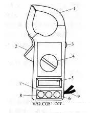 1-钳头2-钳头扳机3-保持开关4-旋转开关5-显示器6-绝缘测试附件接口7-公共地端8-电压电阻输入端9-手提带